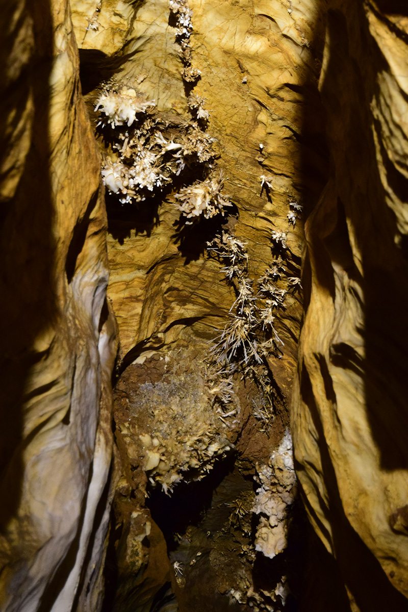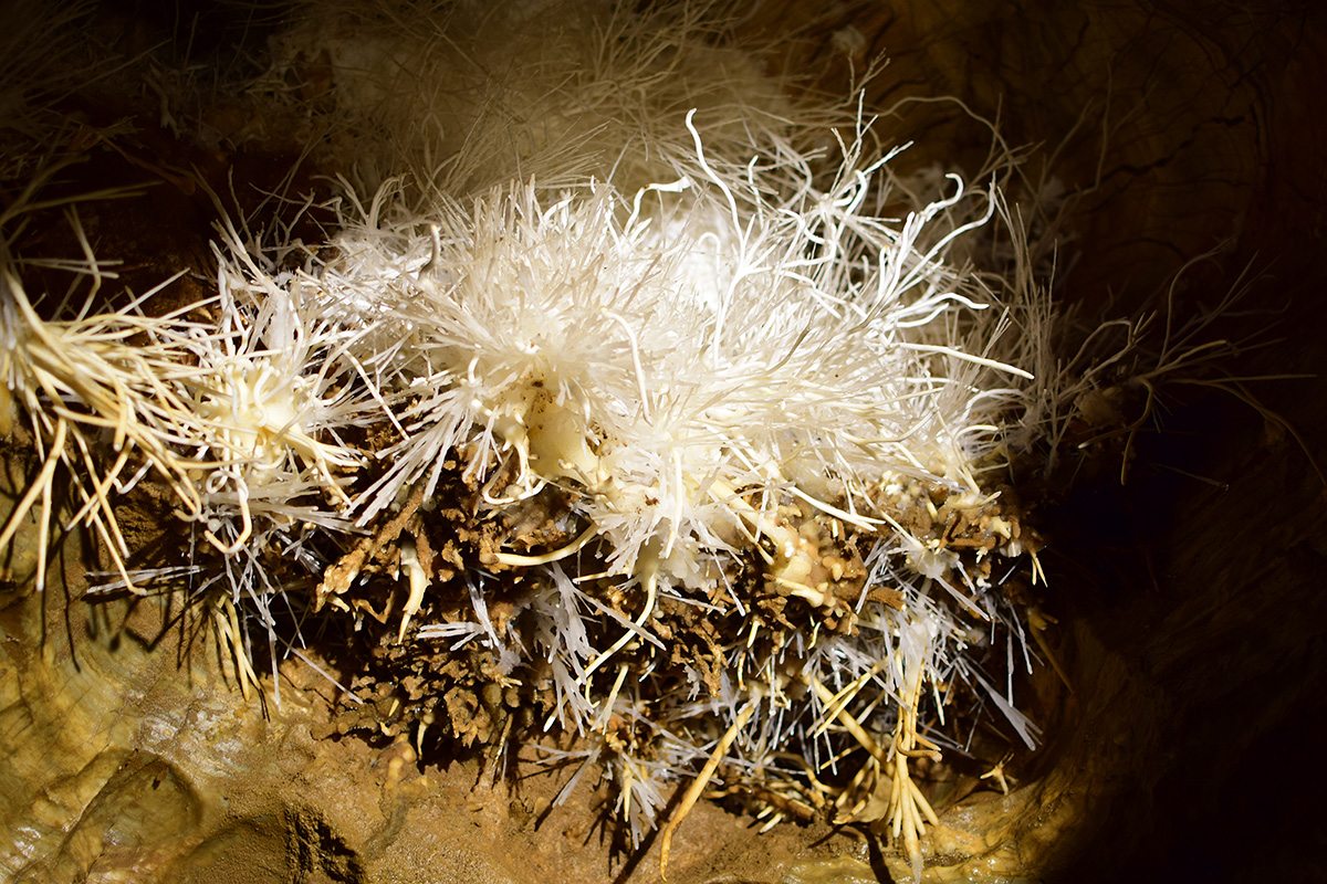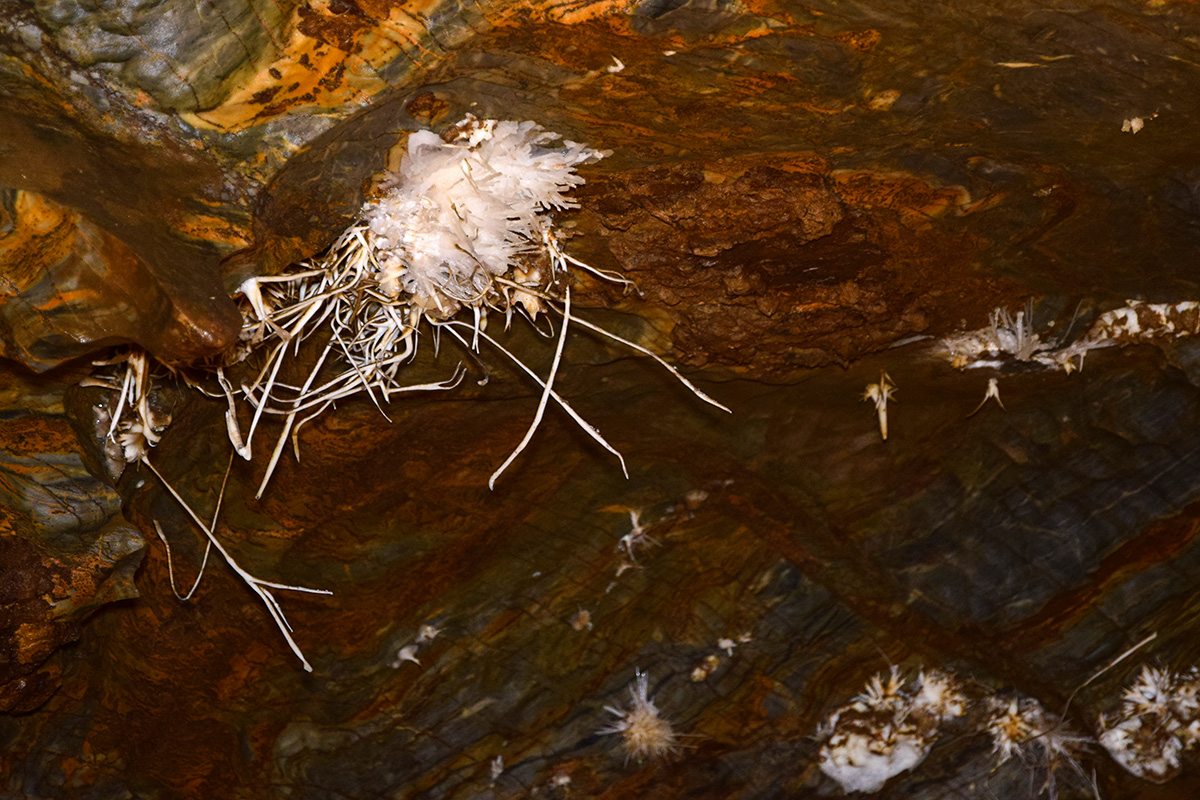 Okolo 230 metrov dlhú trasu sprístupnenú pre verejnosť a hneď niekoľko generácií aragonitu. Tvoria ho vodné roztoky s vysokým obsahom železa, horčíka a mangánu. Tie najstaršie su do biela zafarbené obličkovité útvary staré 120 až 138 tisíc rokov. Najzaujímavejšia a najnetradičnejšia je druhá generácia aragonitu, ktorá formuje dlhé ilhlice – trsy pripomínajúce kvety, alebo trávu. Odhaduje sa im vek približne 14 tisíc rokov. Najmladšia generácia zatiaľ tvorí len pár milimetrové špirálovité útvary a vejáriky.