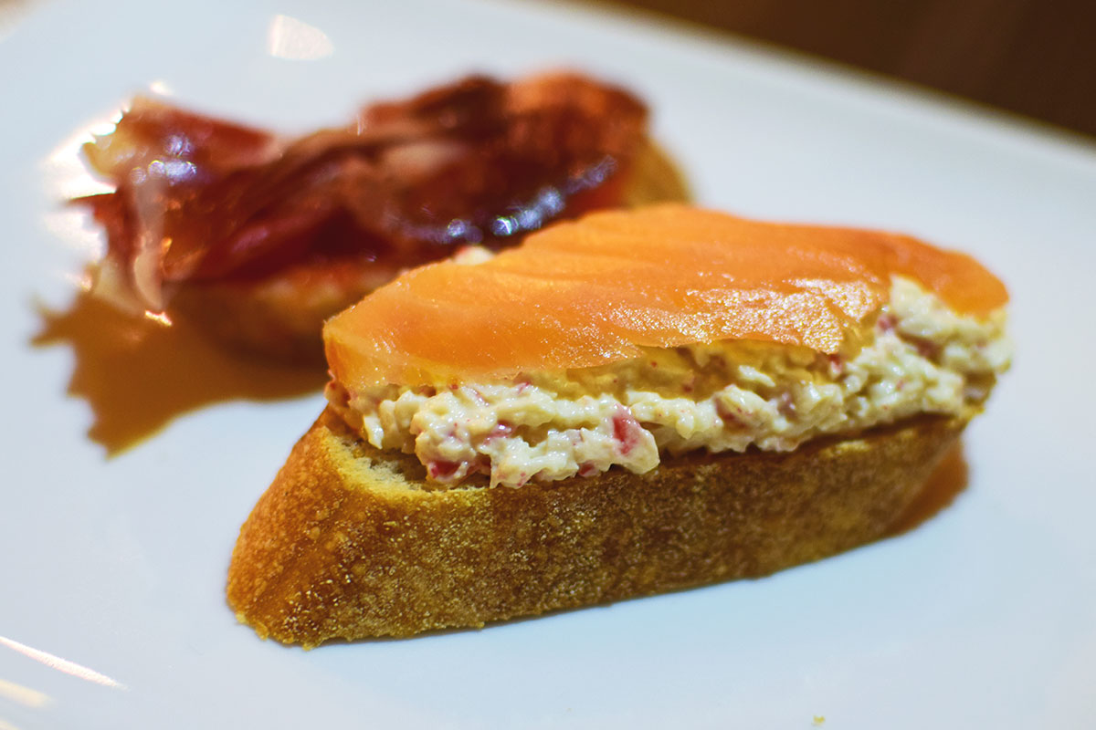 Tapa: Pintxo pan tumaca con jamón, Pintxo crema de cangrejo con salmón