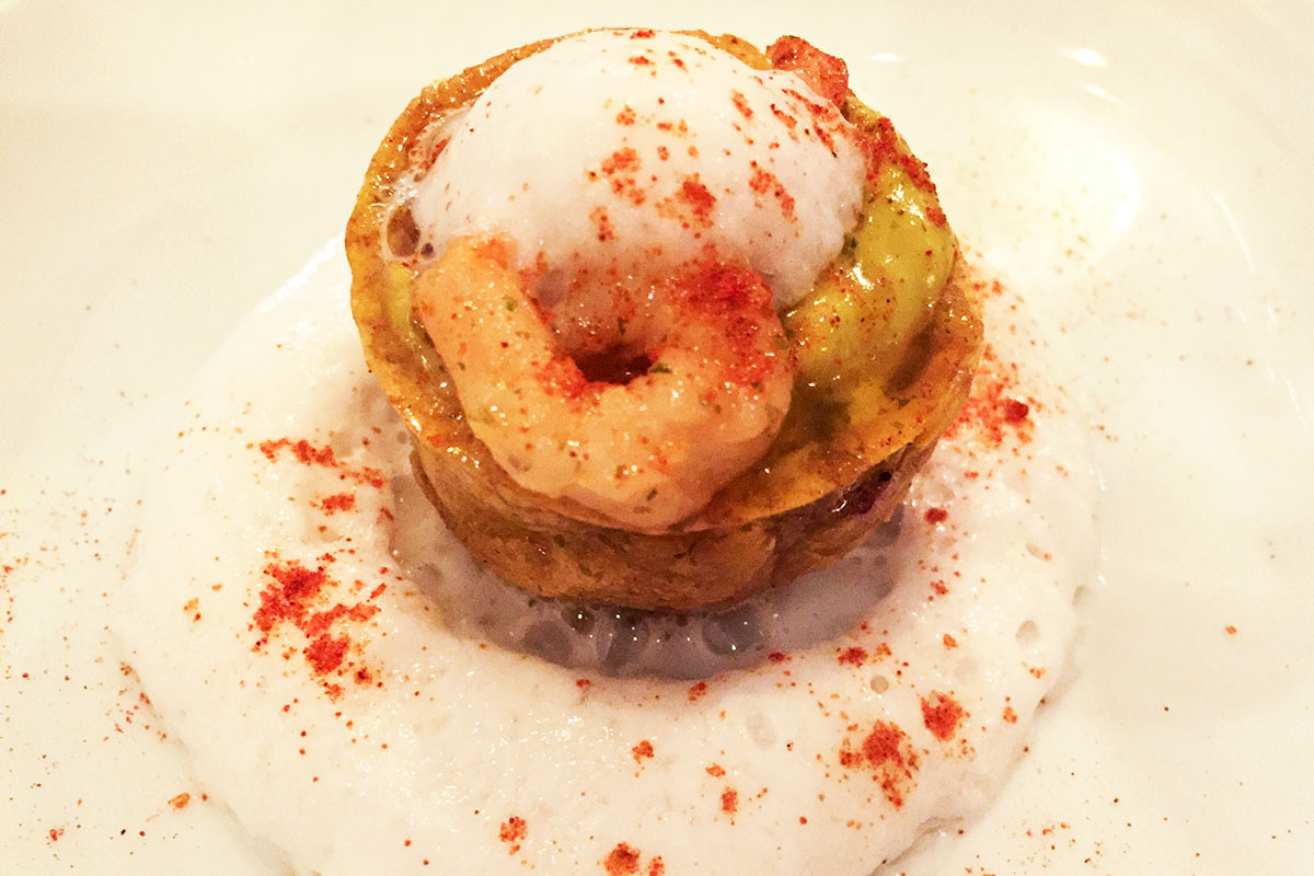 Tapa: crujiente de plátano macho relleno de mouse de guacamole con gamba al ajillo y espuma de coco