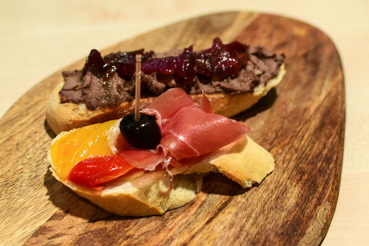 Tapa: Pintxo Terina z kuracích pečienok s karamelizovanou cibuľou a tymiánom, Pintxo Šunka Serano s grilovanou paprikou a čiernou olivou
