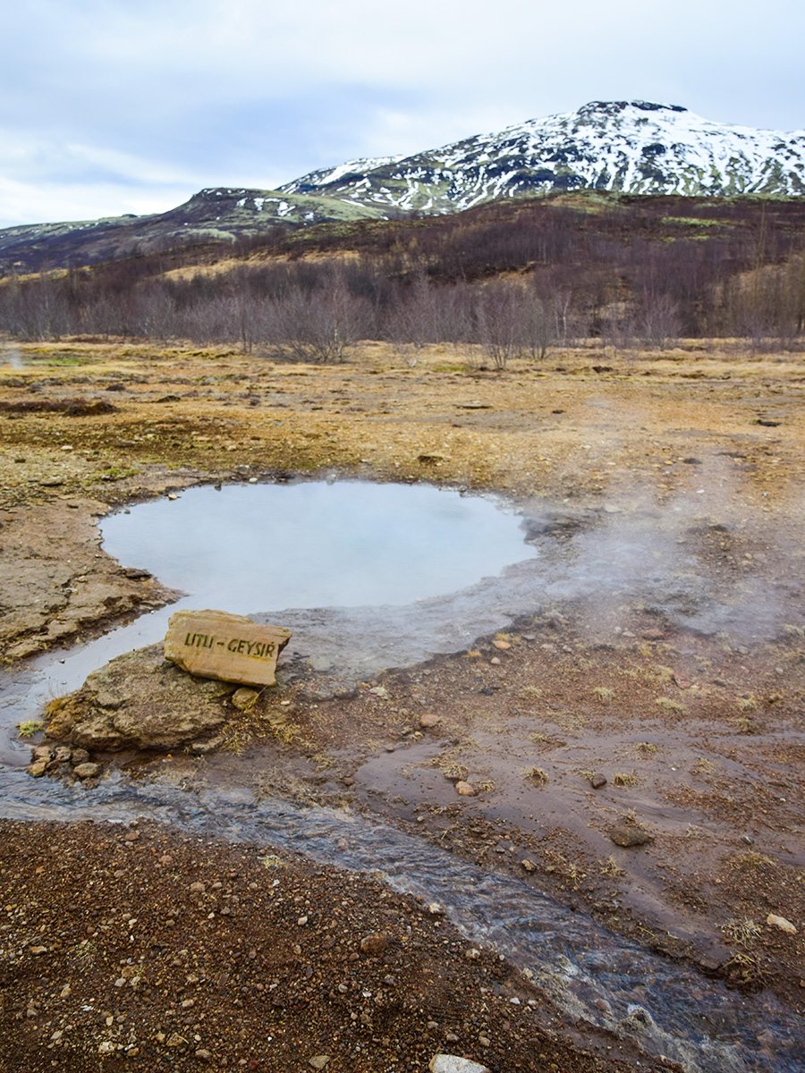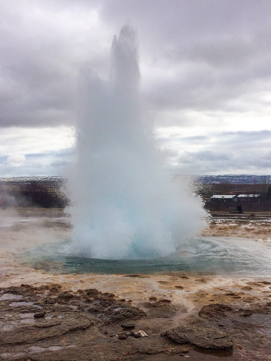 Geotermálna oblasť Haukadalur je známa najmä pre Geysir – slávny prameň, ktorý striekal vodu až do výšky 70 metrov a dal svetu názov pre svojich menších súrodencov. Aj keď v posledných rokoch je aktívny len veľmi zriedka, je tu viac ako 40 horúcich prameňov a dier s horúcim bahnom. Paru s vôňou „vajcovky“ si užijete do sýtosti. Navyše každých 5-10 minút vystrelí vodu a paru do výšky 15-40 metrov gejzír Strokkur. Obkolesený je vášnivými fotografmi, čo čakajú na ten skvelý záber, ktorý vie pokaziť jedine škaredé počasie. Také, ako sme mali my 😉